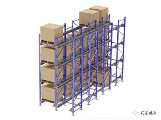 駛?cè)胧截浖苣壳笆亲畛R?jiàn)也是最便宜的托盤(pán)密集存儲(chǔ)系統(tǒng),通常是將貨物先存入,后取出,適合的方向主要為大批量的單一項(xiàng)目貨物,無(wú)法進(jìn)行太多種類劃分。此種貨架系統(tǒng)的優(yōu)勢(shì)在于投資成本比較低廉,但是由于需要利用叉車駛?cè)胴浖茇浀纼?nèi)進(jìn)行操作,所以貨架的深度一般不會(huì)大于10個(gè)以上的托盤(pán)深度,就導(dǎo)致存取貨物的效率比較低下,而由于叉車工具的限制,導(dǎo)致其空間利用率只有60%-75%。