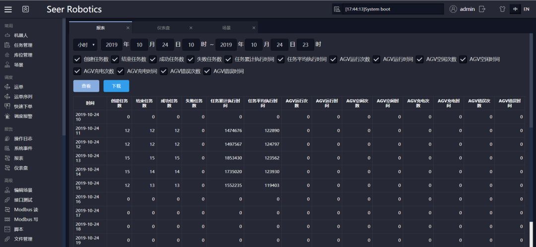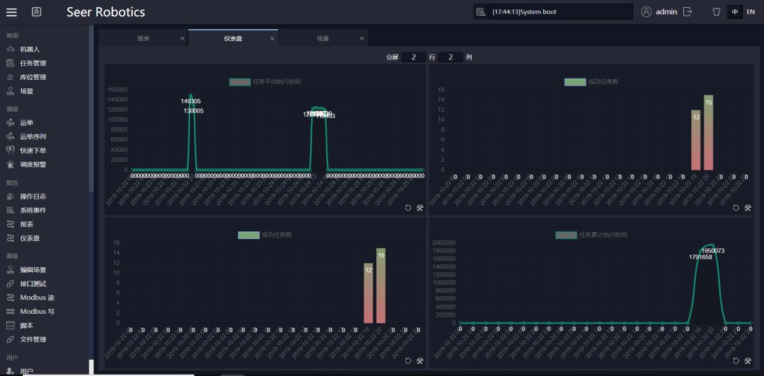 同時(shí)RoboGlue會記錄創(chuàng)建任務(wù)數(shù)、結(jié)束任務(wù)數(shù)、成功任務(wù)數(shù)、失敗任務(wù)數(shù)、任務(wù)累計(jì)執(zhí)行時(shí)間、AGV運(yùn)行次數(shù)、AGV運(yùn)行時(shí)間、AGV充電次數(shù)等一系列信息,用戶可根據(jù)需要勾選了解某一時(shí)間段的任務(wù)及AGV情況,并能通過“儀表盤”的形式直觀體現(xiàn)出來,便于用戶根據(jù)RoboGlue了解全場物流信息及物流狀況,助力用戶實(shí)現(xiàn)真正實(shí)現(xiàn)智能化物流。
