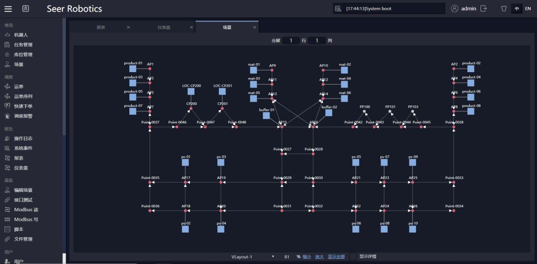 同時(shí),可視化管理系統(tǒng)RoboGlue中有場景功能,能夠?qū)崟r(shí)監(jiān)控移動(dòng)機(jī)器人運(yùn)行位置,從而能夠通過RoboGlue實(shí)時(shí)掌握全局物流信息狀況。