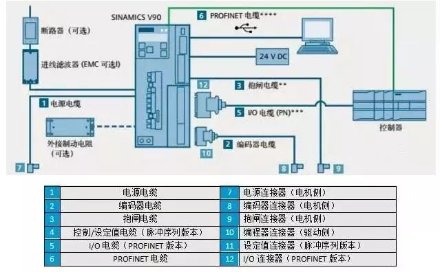 SINAMICS V90 PROFINET 版本的系統(tǒng)接線圖: