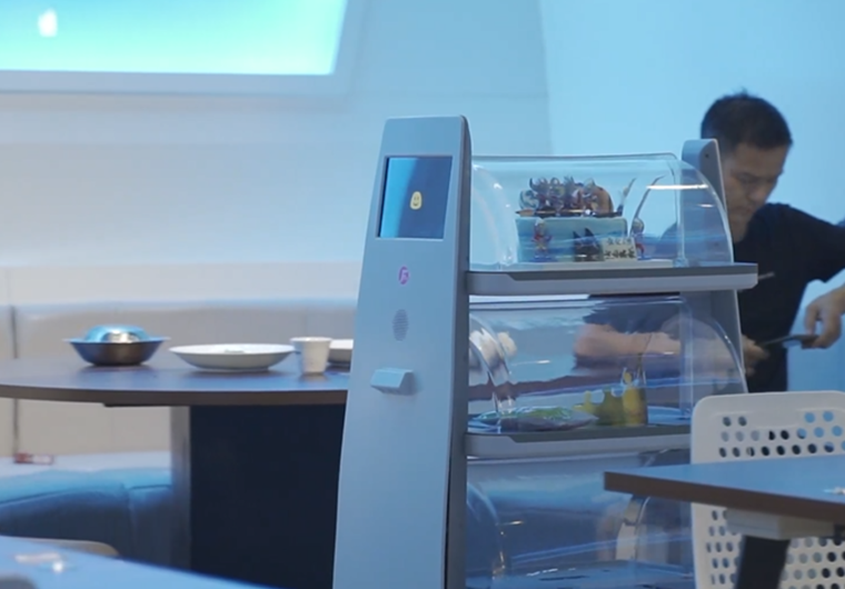 除了“云軌”送餐,餐廳還有一系列地面服務機器人。長得像小餐車的送餐機器人,能夠把菜肴送到每一個顧客點單的角落,而且會繞開路上的障礙,身手十分靈活。