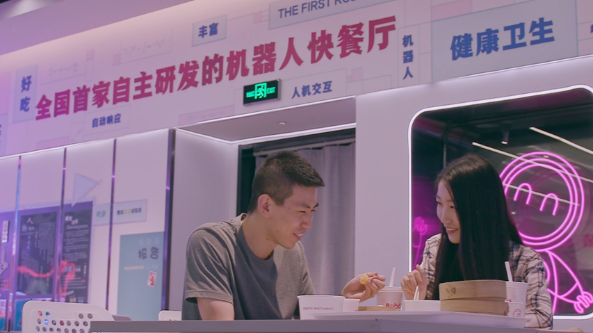 走進餐廳,不論是天花板上跑著的小機器人,還是櫥窗里的巨大機械手臂,都讓人耳目一新。