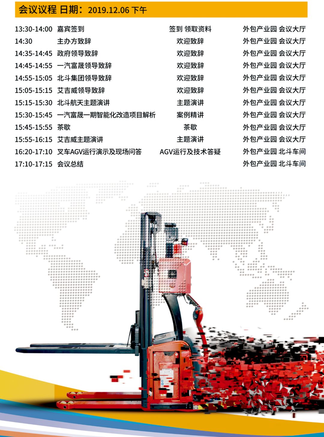 在此背景下,由一汽富晟集團、北斗航天汽車、蘇州艾吉威主辦,吉林壹嘉科技承辦的“智慧物流·智能AGV技術(shù)交流會”將于2019年12月6日在長春高新國際服務(wù)外包產(chǎn)業(yè)園召開。此次峰會將圍繞智能制造、工業(yè)機器人、人工智能、5G等話題進行深入探討,推動新技術(shù)、新模式、新解決方案以及無人倉運生態(tài)聯(lián)盟的建立與完善。