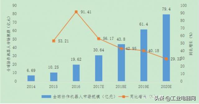 2012-2020年全球協(xié)作機(jī)器人產(chǎn)業(yè)規(guī)模及同比增長(zhǎng)