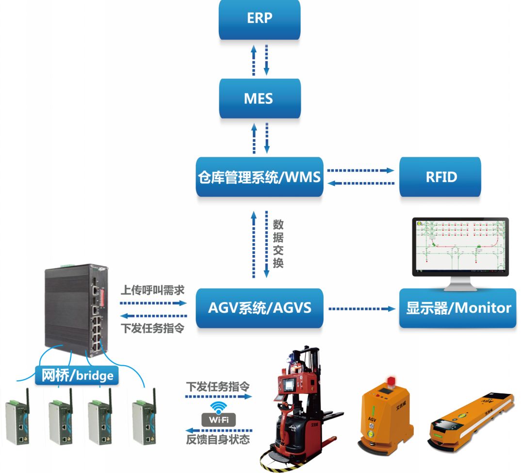 為了解決這個(gè)問題,艾吉威在AGVS之外還自主開發(fā)了倉庫管理系統(tǒng)(WMS),并推動(dòng)這兩個(gè)系統(tǒng)與工廠原有的生產(chǎn)過程管理系統(tǒng)(MES)、企業(yè)資源計(jì)劃(ERP)和射頻識(shí)別系統(tǒng)(RFID)共享同一套數(shù)據(jù),根據(jù)生產(chǎn)線的需求決定AGV的搬運(yùn)。其原理是,WMS根據(jù)其他系統(tǒng)的數(shù)據(jù)計(jì)算出所需原料,將這個(gè)信息放入與AGVS對接的中間表中(數(shù)據(jù)庫中專門存放中間計(jì)算結(jié)果的數(shù)據(jù)表),AGVS通過解碼理解信息,自主安排搬運(yùn)節(jié)奏。