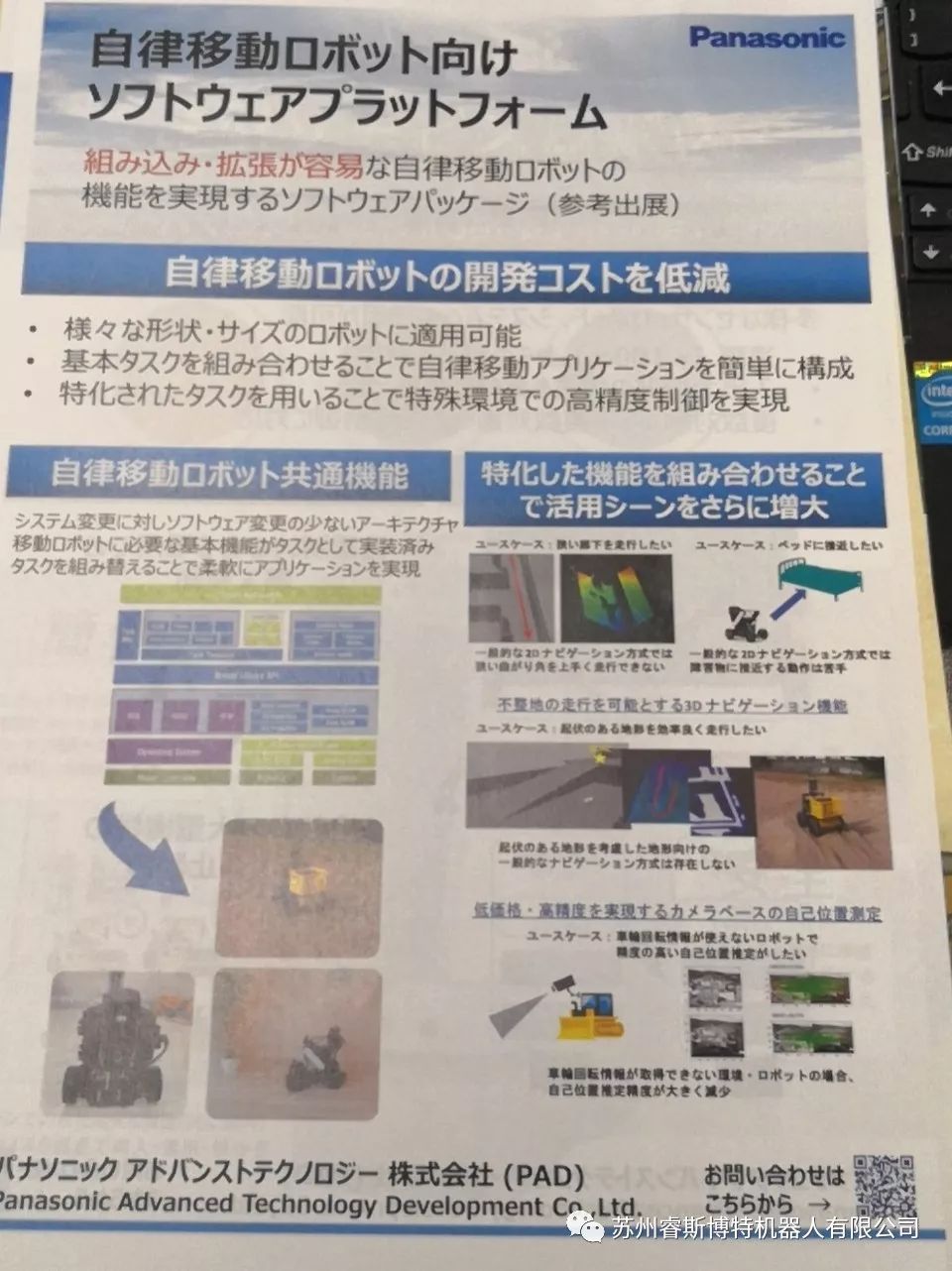 相比較國內(nèi)比較熱門的激光導航定位技術,日本也有廠商展示了自己的自主定位導航控制系統(tǒng),比如日本松下。比較有趣的是,當時在展臺負責介紹技術松下自主定位導航技術的博士也是位華人(國籍不詳)