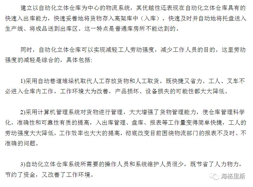 海格里斯在建設(shè)自動(dòng)化立體倉庫上的建議是,在規(guī)模及出入庫頻率要求相同的情況下,從投資角度分析,建設(shè)自動(dòng)化立體庫比建設(shè)高位叉車庫房節(jié)約,且自動(dòng)化立體庫房每年的運(yùn)行費(fèi)用比高位叉車庫房低。從管理角度分析,建設(shè)自動(dòng)化立體倉庫會(huì)提高工作效率,可以解決目前困擾物流部門的報(bào)表不及時(shí)、數(shù)據(jù)不準(zhǔn)確、庫損嚴(yán)重、錯(cuò)誤發(fā)貨、人員管理混亂、安全事故多等許多問題。