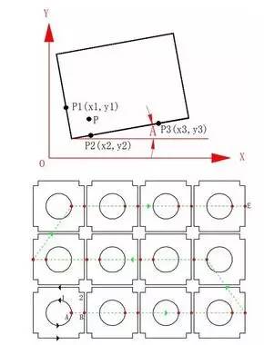 啟動(dòng)自動(dòng)尋邊功能后,切割頭從P點(diǎn)出發(fā),自動(dòng)測(cè)得板料兩垂直邊上的3點(diǎn):P1、P2、P3,并據(jù)此自動(dòng)計(jì)算出板料的傾斜角度A,以及板料的原點(diǎn)。