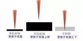 切割不同材料時(shí),要求激光束的焦點(diǎn)落在工件截面的不同位置。如下圖所示。