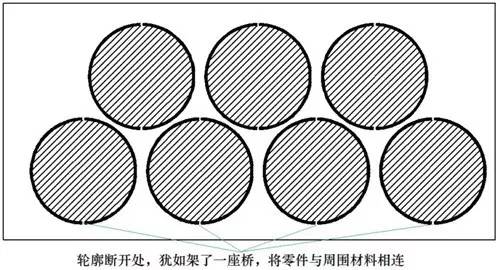 利用橋位(微連接)切割工藝,可避免發(fā)生此種現(xiàn)象。在對(duì)圖形進(jìn)行激光切割編程時(shí),有意將封閉的輪廓,斷開若干處,使得切割完成后零件與周圍的材料粘連在一起,不致掉落,這些斷開處,就是橋位。也稱為斷點(diǎn),或微連接(這種叫法源自對(duì)MicroJoint的生硬翻譯)。斷開的距離,約0.2~1mm,與板料的厚度成反比。基于不同的角度,有了這些不同的叫法:基于輪廓,斷開了,所以叫斷點(diǎn);基于零件,與母材相粘連,所以叫橋位或微連接。