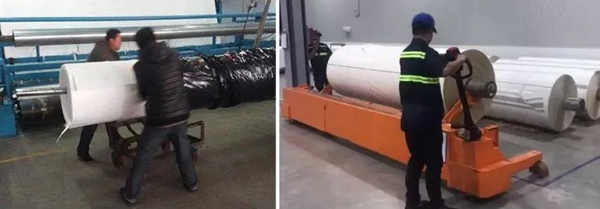 現(xiàn)有的生產(chǎn)車間布料卷筒進行搬運時,一般是將其放置到平板推車上進行搬運,而平板推車一般比較低,需要人工將布卷從平板上抬起,費時費力,效率低,人工勞動量大。
