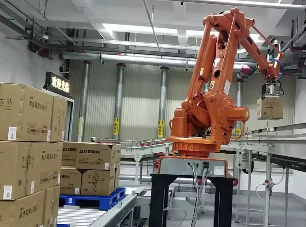 2.2、碼垛機(jī)械手系統(tǒng):負(fù)責(zé)生產(chǎn)車(chē)間輸送來(lái)的成品箱碼垛。