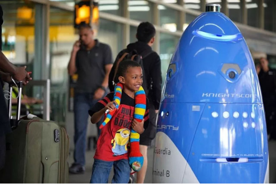 值得注意的是,許多機場已添加了機器人來作為安全人員,以掃描威脅并檢測武器。例如,一種新型安保機器人開始在紐約三大機場之一的拉瓜迪亞機場上崗巡邏。這個新來的安全衛(wèi)士是由Knightscope公司生產(chǎn)的K5型機器人。