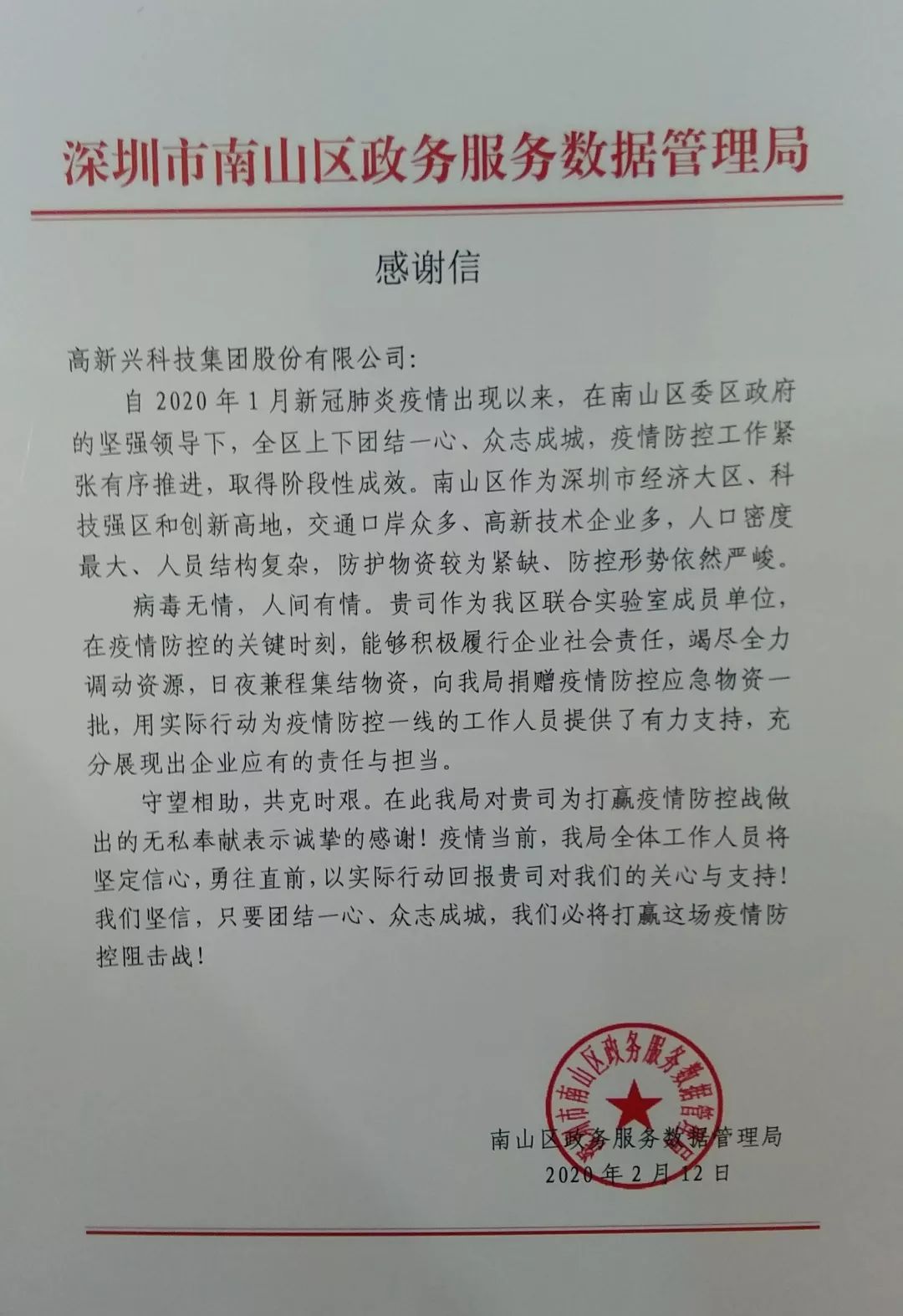 圖/深圳市南山區(qū)政務(wù)服務(wù)數(shù)據(jù)管理局向高新興發(fā)送的感謝信