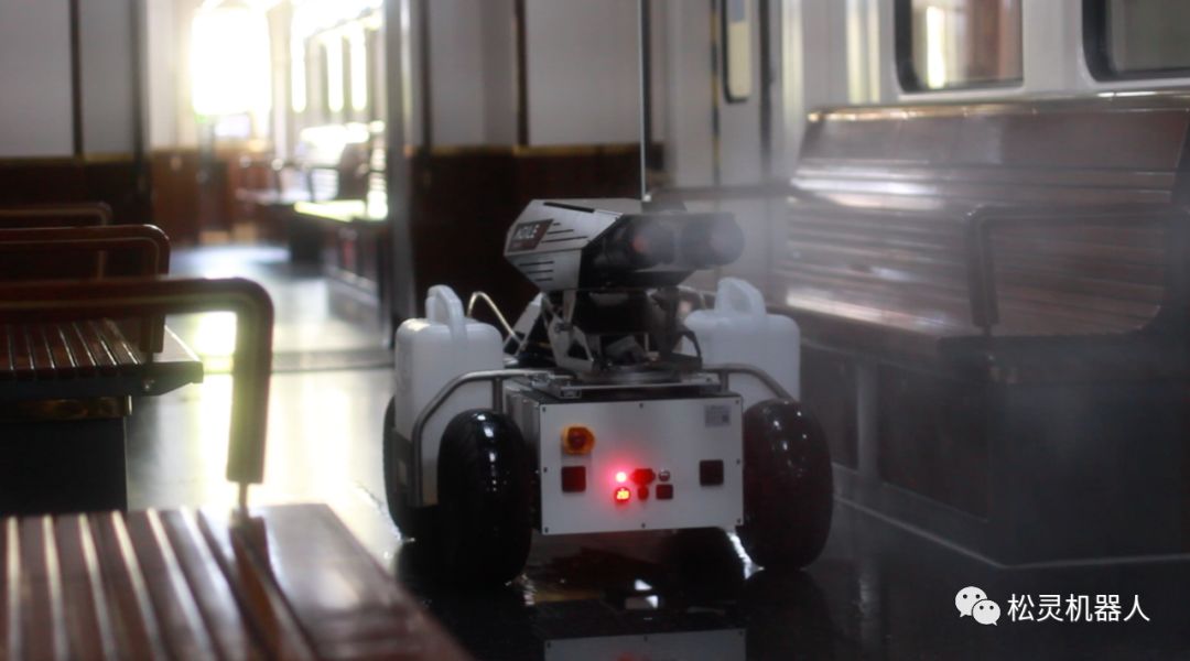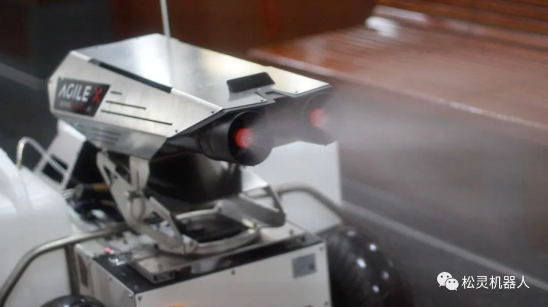 底盤技術(shù)是松靈機(jī)器人優(yōu)勢(shì),本次用于展示的消毒機(jī)器人使用的是“HUNTER機(jī)器人”,是一款采用阿克曼轉(zhuǎn)向設(shè)計(jì)的底盤,具有和汽車類似的特征,在普通水泥、柏油道路上優(yōu)勢(shì)明顯,適合長(zhǎng)時(shí)間工作。