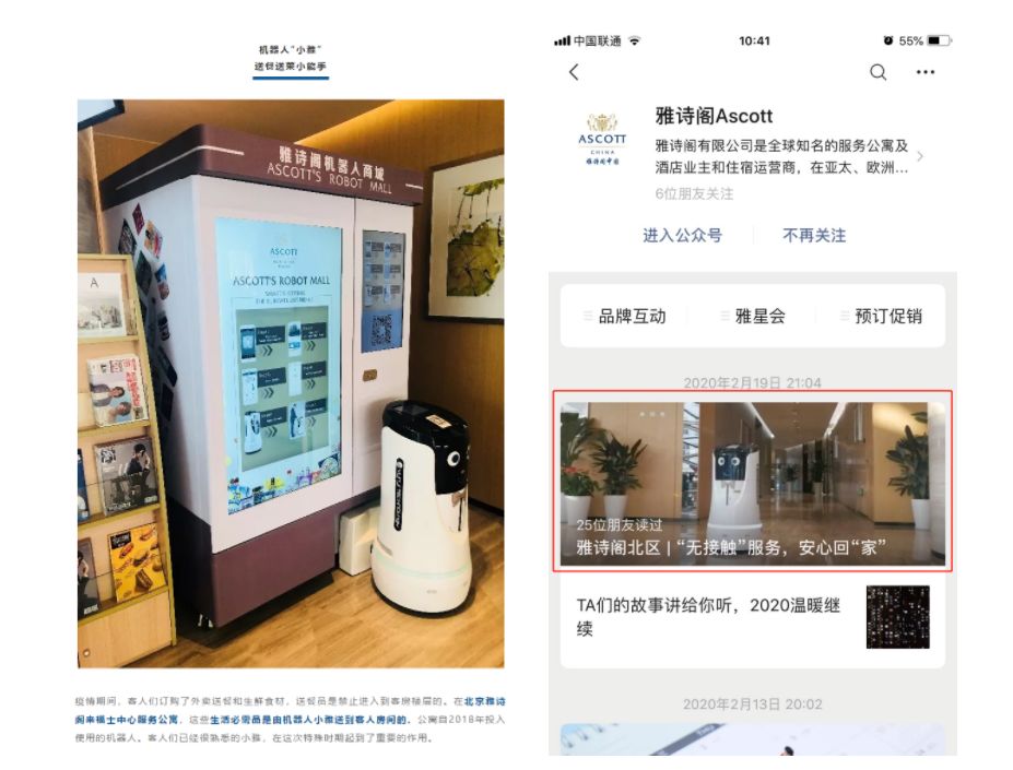 疫情期間,雅詩閣第一時(shí)間啟動“無接觸式”服務(wù),替代現(xiàn)有“標(biāo)準(zhǔn)化”服務(wù)??腿藗円呀?jīng)很熟悉的機(jī)器人“小雅”,在這次特殊時(shí)期起到了重要的作用。