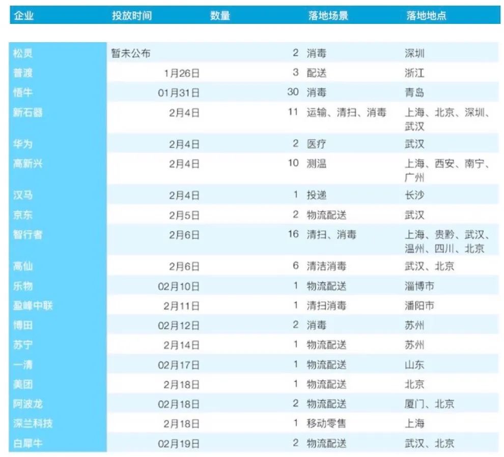 除此之外,據(jù)不完全統(tǒng)計(jì),京東、白犀牛、新石器聯(lián)合華為,三家均進(jìn)入武漢疫區(qū),但車輛數(shù)只有1-2臺(tái),華為、普渡、盈峰中聯(lián)、深蘭科技、博田等4家企業(yè)根據(jù)目前發(fā)布的報(bào)道,僅有無(wú)人車送往各地,暫未公布最新進(jìn)展。