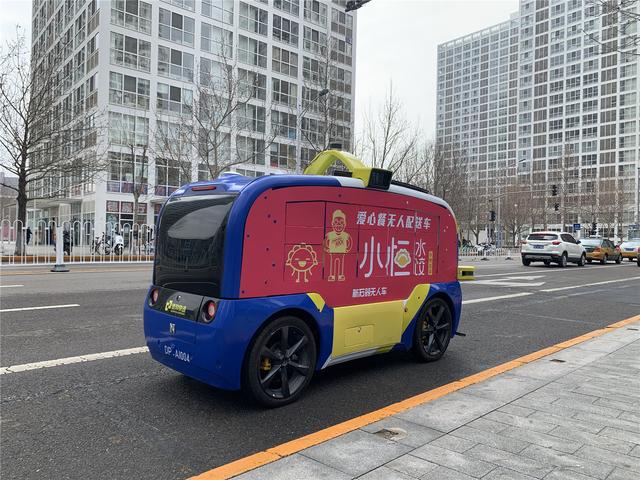 小恒水餃無人送餐車近日在北京CBD(中央商務區(qū))運營,有保溫功能,一天可以送三四百單。
