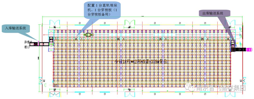 堆垛機+穿梭車形式的自動化密集倉庫,利用了堆垛機在主巷道前后及上下方向運行,穿梭車在子巷道運行的特點,兩個設(shè)備通過南京音飛集團WCS軟件調(diào)度配合,完成貨物的取放。