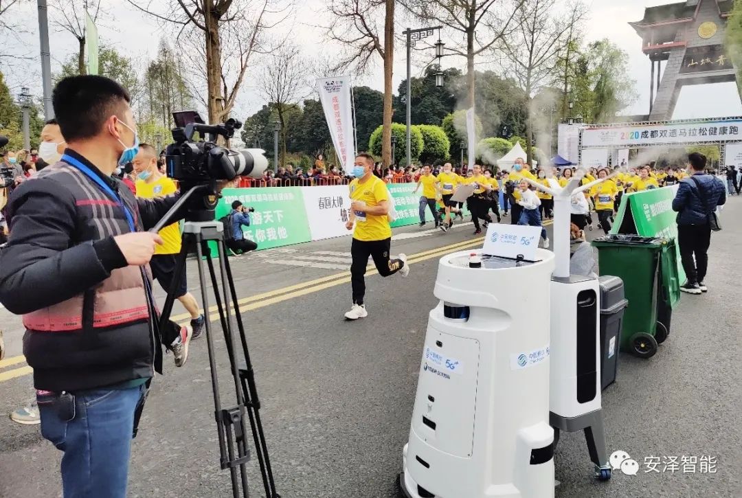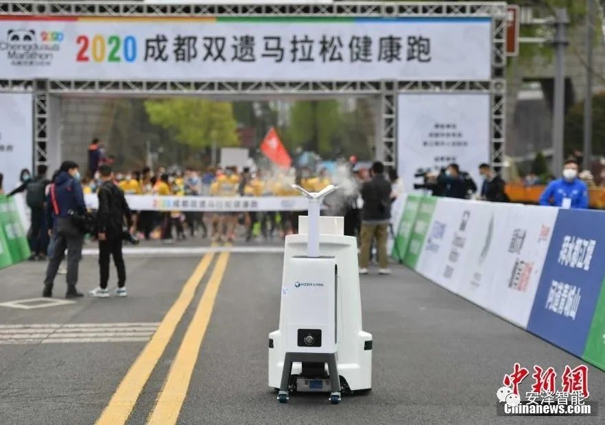 比賽開始之前,一臺身上印有“中國移動5G”及“安澤智能”字樣的機(jī)器人就在起跑點來回“轉(zhuǎn)悠”,對起跑點的各個區(qū)域進(jìn)行消毒,這一行為引起了不少人的注意。