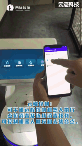 消毒機器人屏幕上可進行定時、定點、定線路設置。多樓層、多點位定時消毒,搭配APP使用,可操作機器人回充電樁、集合點,開啟點位消毒與定點消毒。機器人工作流程可遠程控制。