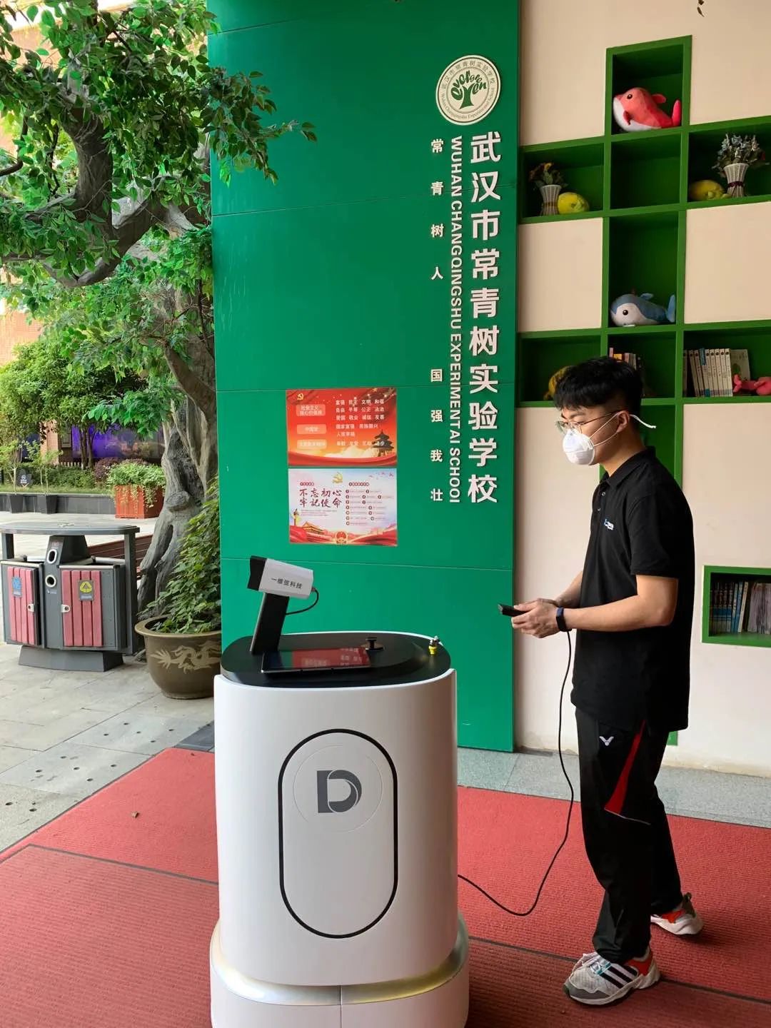 服務(wù)于武漢市常青樹實(shí)驗(yàn)學(xué)校的防疫機(jī)器人MoRo S具備體溫檢測、口罩檢測、消毒液噴灑等功能。