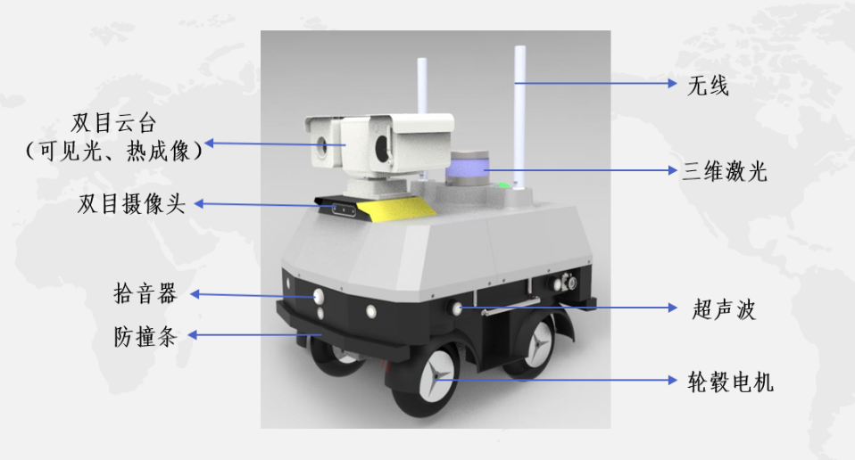 小型智能巡檢機(jī)器人集成了全向移動(dòng)底盤、三維激光雷達(dá)、智能云臺(tái)、可見光攝像機(jī)、紅外熱像儀、超聲波、探溝、拾音器等部件,滿足室外復(fù)雜環(huán)境下不同對(duì)象的檢測(cè)要求,對(duì)狹窄路況、狹小空間有更強(qiáng)的適應(yīng)性。