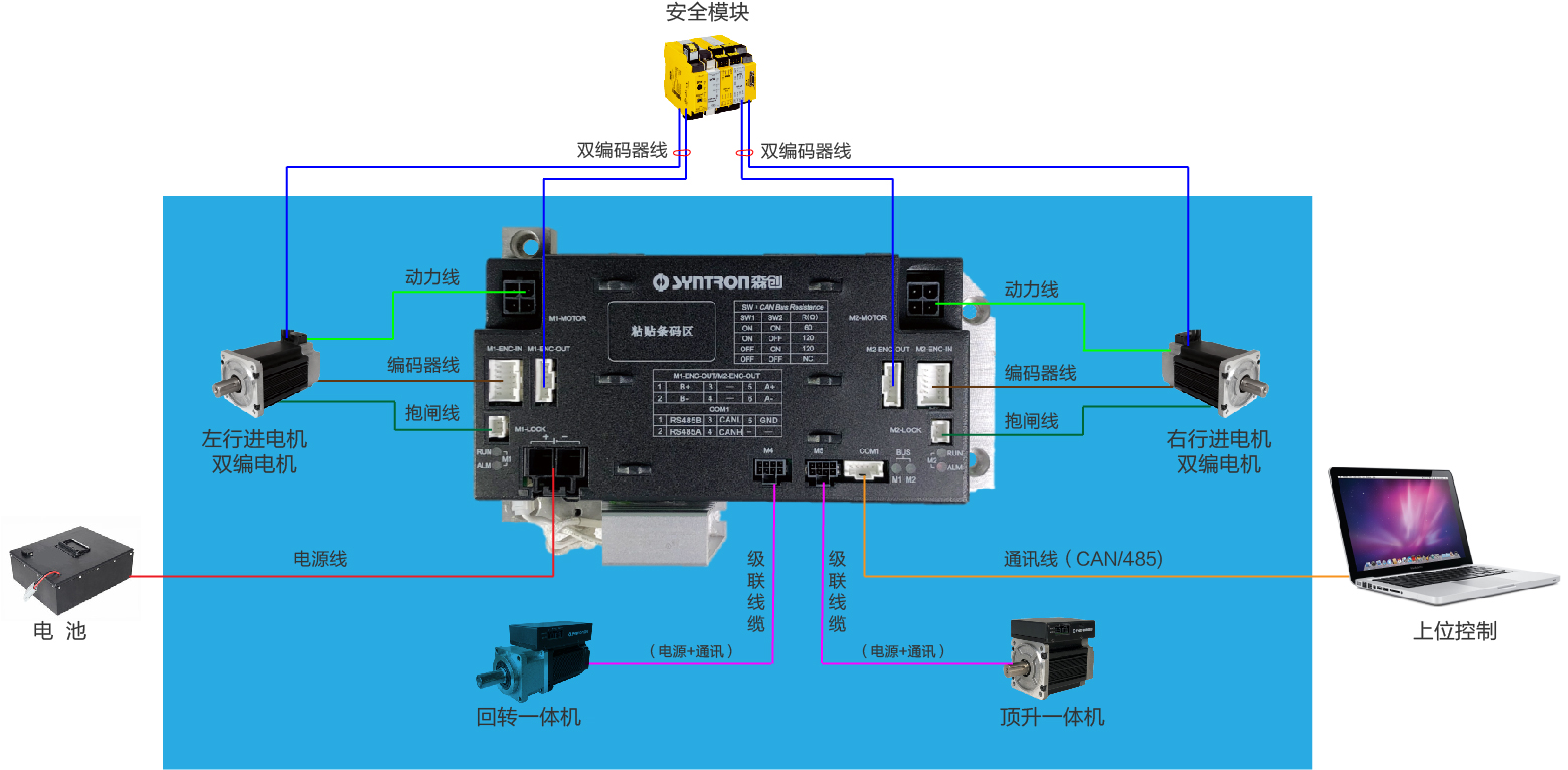 M2.2模塊化集成方案是由我公司在AGV行業(yè)內(nèi)率先提出的系統(tǒng)模塊化解決方案,客戶上位控制與M2.2方案僅需要一根電源線和一根通訊線連接。