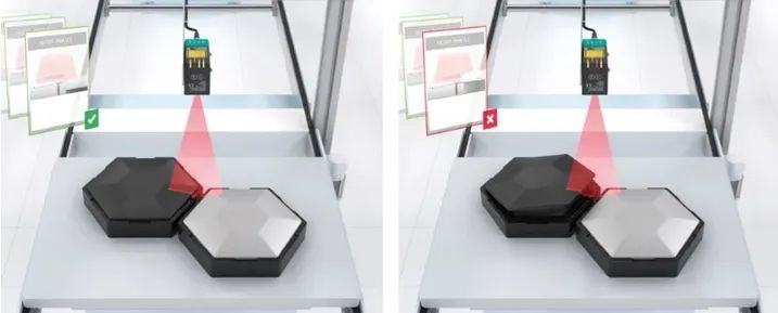 使用倍加福 SmartRunner Matcher 光截面?zhèn)鞲衅?,可以在一個(gè)步驟中完成兩個(gè)檢測(cè)任務(wù)。將傳感器安裝在輸送機(jī)系統(tǒng)的上方,通過檢測(cè)高度輪廓同時(shí)進(jìn)行兩個(gè)項(xiàng)目的檢測(cè)。當(dāng)這些高度輪廓與存儲(chǔ)在傳感器中的參考輪廓相匹配時(shí),開關(guān)輸出將發(fā)送“良好”信號(hào)。不同的高度輪廓,則表明原材料有缺失或位置放置不正確,并且傳感器發(fā)送“錯(cuò)誤”信號(hào)。因此,SmartRunner Matcher 可以防止浪費(fèi)和工廠停機(jī),從而提高生產(chǎn)效率。
