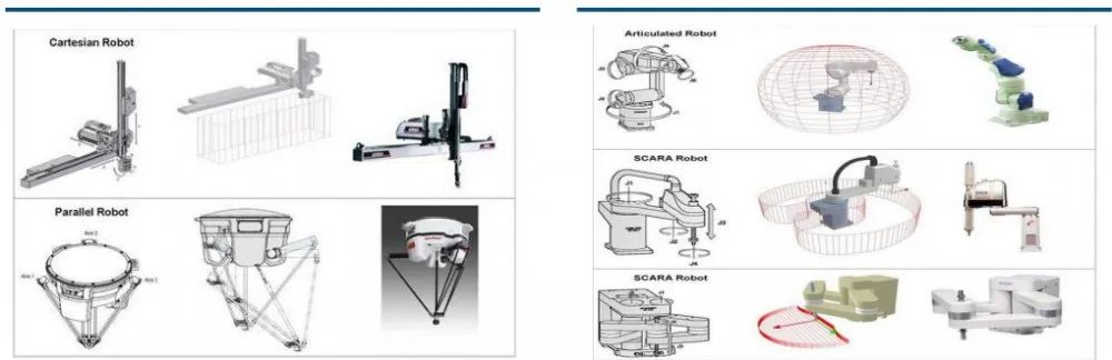 按照機(jī)械結(jié)構(gòu),工業(yè)機(jī)器人可分為直角坐標(biāo)型、圓柱坐標(biāo)型、球面坐標(biāo)型、垂直多關(guān)節(jié)型、SCARA型(平面多關(guān)節(jié)機(jī)器人)及Delta型(并聯(lián)關(guān)節(jié)機(jī)器人)