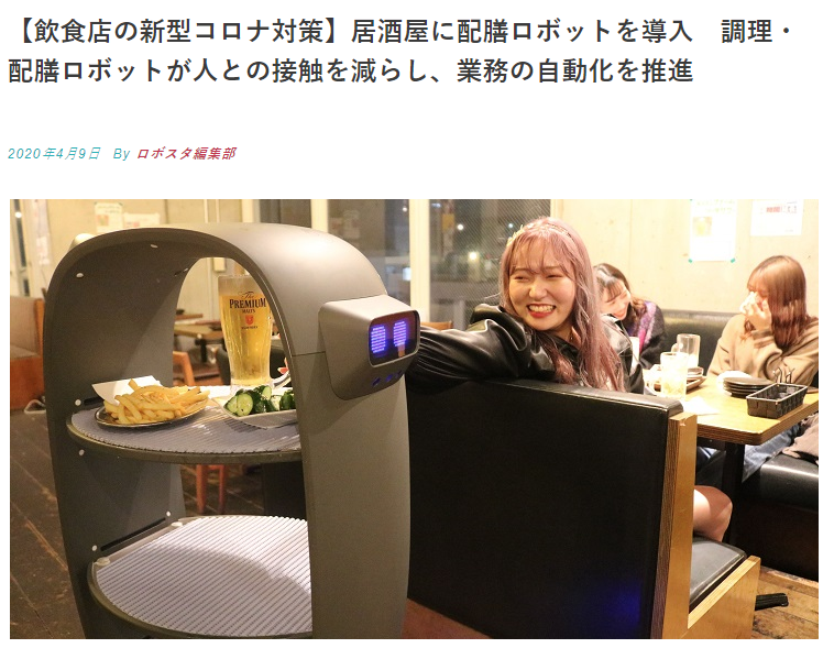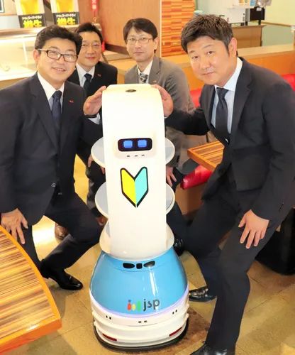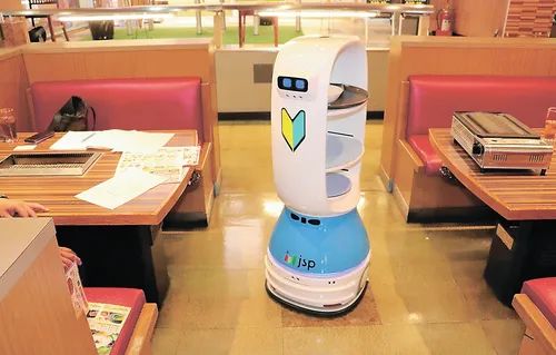 該店引進了兩個機器人服務員,一臺用于配膳一臺用于收臺。店員將料理放在托盤上,通過觸摸屏操作指定座位,機器人即可移動到餐桌位置。機器人感知到食物被領取后移動到下一個座位。送餐途中人一站在面前擋路,它就露出為難的表情,并語音提示“請不要擋著我”,確認取餐后摸摸頭就回廚房,讓來店的客人開心。