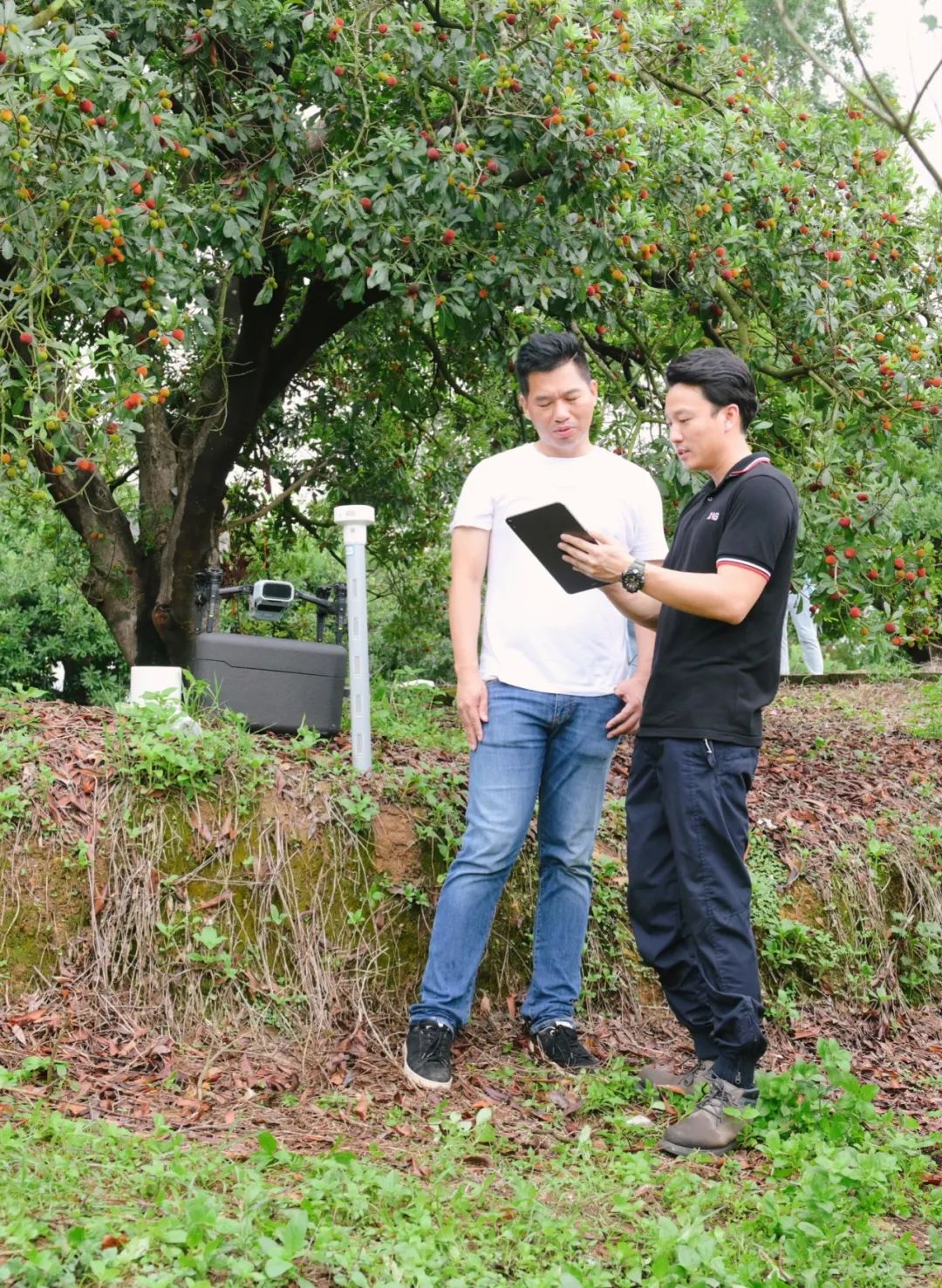 廣東“盒馬村”智慧農(nóng)場,極飛聯(lián)合創(chuàng)始人龔槚欽(右)與基地負責人(左)正在查看智慧農(nóng)業(yè)系統(tǒng)