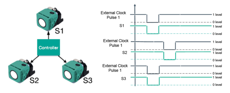 內(nèi)部同步,軟件直接選擇對(duì)應(yīng)的同步模式,簡(jiǎn)單短接傳感器的同步功能線即可開(kāi)始工作。外部同步,控制器通過(guò)IO節(jié)點(diǎn)有序發(fā)送觸發(fā)脈沖(高電平:傳感器待機(jī),低電平:正常工作),分別對(duì)各超聲波傳感器控制,更可靈活實(shí)現(xiàn)針對(duì)應(yīng)用的復(fù)雜功能。
