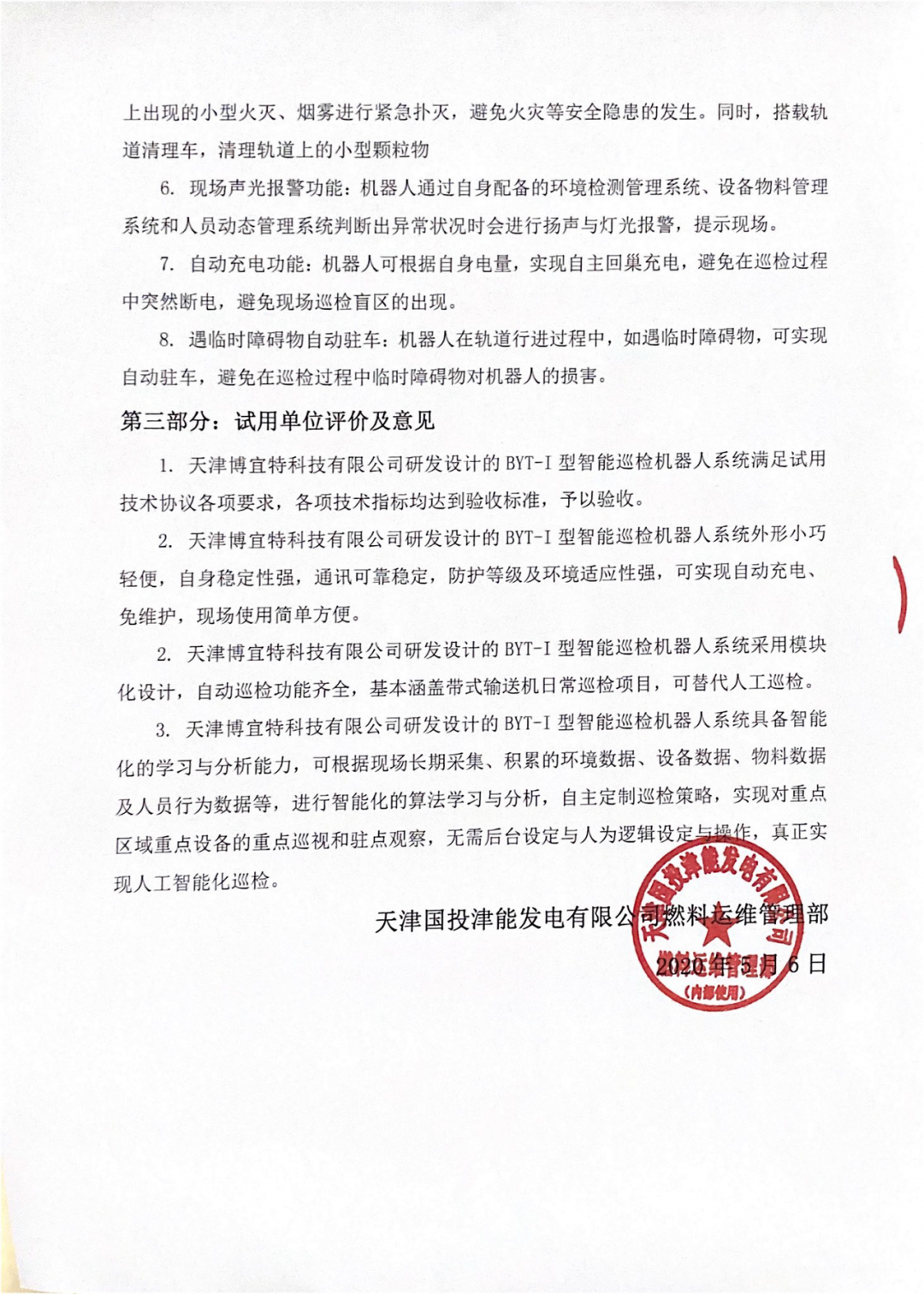 2020年5月——獲得天津國投津能發(fā)電有限公司出具的智能巡檢機器人試用報告,滿足試用技術(shù)協(xié)議各項要求,各項技術(shù)指標均達到驗收標準,通過驗收。