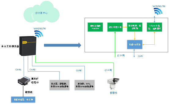 (6) 工業(yè)服務(wù)器內(nèi)置的WIFI/4G/5G模塊,結(jié)合軟網(wǎng)關(guān)應(yīng)用,可實(shí)現(xiàn)工程車輛遠(yuǎn)程維護(hù)、控制,以及云端多車協(xié)同控制。