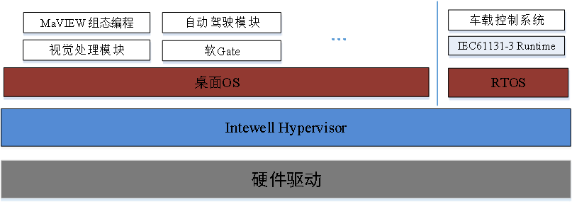 (4) 利用工業(yè)服務(wù)器預(yù)裝的Intewell操作系統(tǒng)高實(shí)時(shí)虛擬化特性,利用軟件定義一個(gè)實(shí)時(shí)系統(tǒng)(PLC)用于工程機(jī)械的控制,定義一個(gè)桌面系統(tǒng)用于集成自動(dòng)駕駛算法以及視覺處理。如下圖;