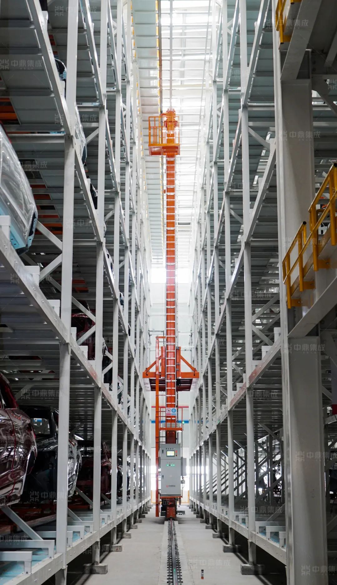 彩車身立體庫高17.2米,包含倉儲(chǔ)區(qū)和輸送區(qū)。倉儲(chǔ)區(qū)包含7個(gè)巷道,規(guī)劃了7臺(tái)中鼎集成雙立柱堆垛機(jī)以及917個(gè)貨位、7個(gè)維修貨位。輸送區(qū)共設(shè)計(jì)四層輸送線,一層:對(duì)總裝二線出庫;二層:對(duì)總裝一線出庫;三層:涂裝一線入庫;四層:涂裝二線入庫。