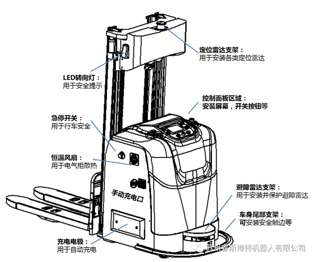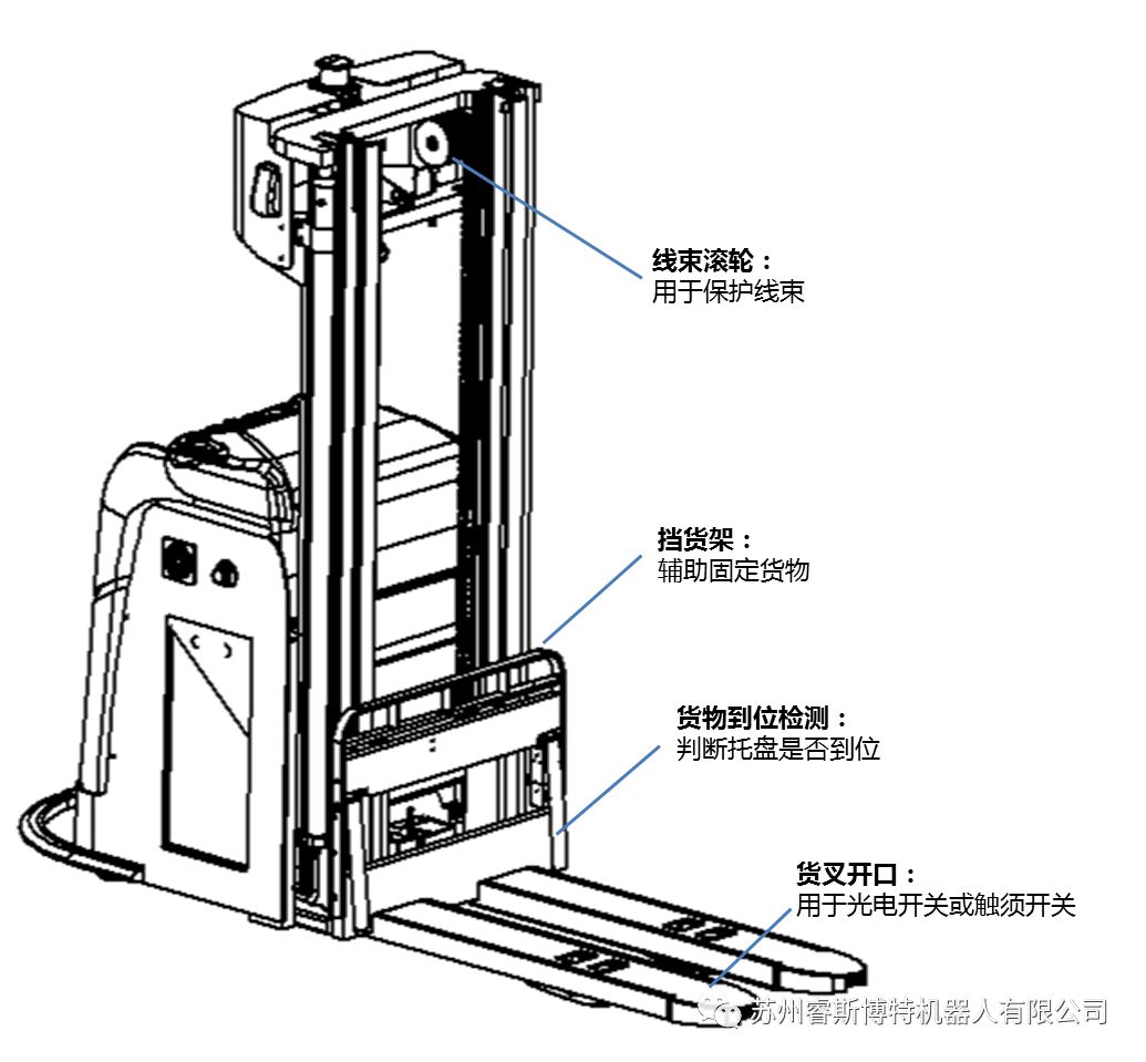 除了在部件選型用心配置外,在設(shè)計(jì)上,我們采用模塊化設(shè)計(jì),可以按照客戶的要求,進(jìn)行選配。如客戶可以在舵輪總成上安裝一個(gè)絕對(duì)值編碼器,用于提高轉(zhuǎn)向精度;也可以在門架上安裝一臺(tái)TOF相機(jī),用于棧板識(shí)別。