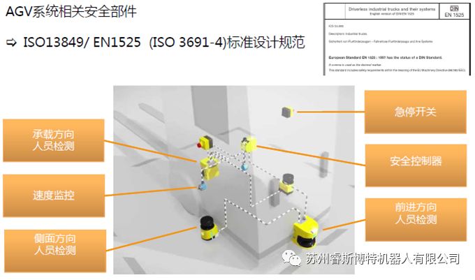 此外,基于自動(dòng)駕駛的AGV叉車在安全性上比人工駕駛的叉車要求更高,尤其在出口的時(shí)候,需要符合EN1525 Safetyof industrial trucks - Driverless trucks and their systems標(biāo)準(zhǔn),如果面向美國(guó)市場(chǎng),需要參考UL3100 Outlineof Investigationfor Automated Guides Vehicles(AGV)等標(biāo)準(zhǔn)。因此需要在周身布置多個(gè)安全激光雷達(dá)等安全產(chǎn)品。