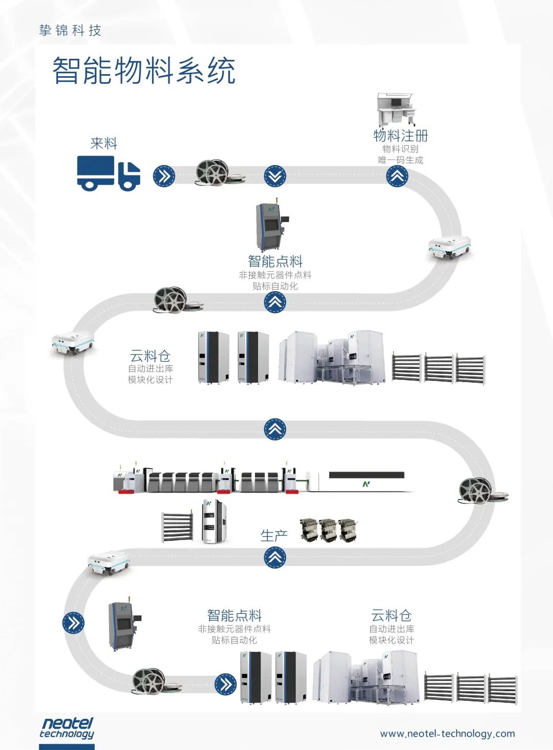 下圖解釋了摯錦科技的智能物料系統(tǒng),從中可見MiR移動機器人如何讓該系統(tǒng)如虎添翼: