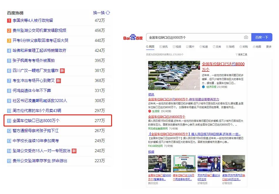 2020年7月8日上午,有關(guān)“全國停車缺口已達8000萬個”話題排到百度熱榜第11位,閱讀量277萬,人民日報、經(jīng)濟報、生活日報等媒體平臺陸續(xù)發(fā)布。停車難題顯然已成為民生關(guān)注的問題。