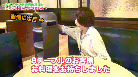 “あなたの料理があります。良い食欲!”(您的餐食到了,請享受您的美食)”餐食送達時,PEANUT時會用可愛的語音播報,同時它的眼睛還會變幻靈動表情,開心地笑彎了雙眼。36歲的崛田 瑞江按照PEANUT的提示取下菜品,并觸摸它的額頭令它原路返回,稱贊道:“它會說話,表情還很可愛呢?!?/p>