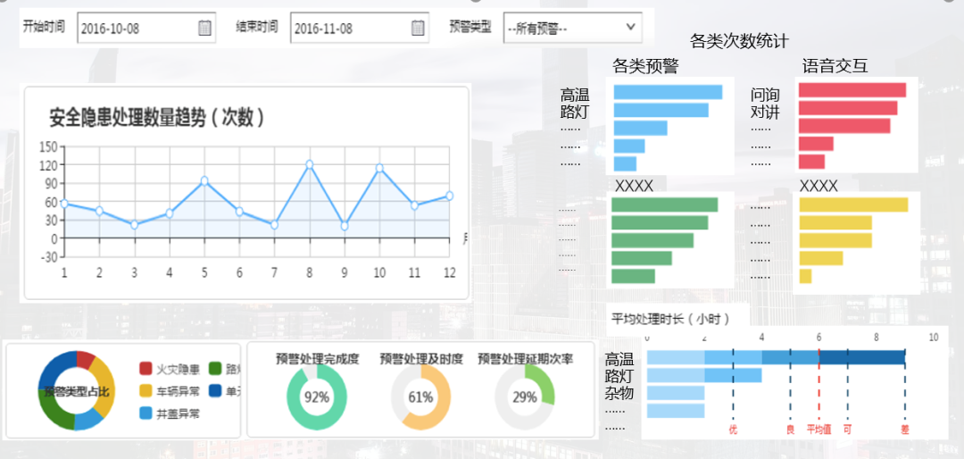 預(yù)警處理:不同預(yù)警消息,設(shè)置成為不同的預(yù)警級(jí)別,不僅在后臺(tái)預(yù)警,還同時(shí)通過APP或者短信平臺(tái),將預(yù)警消息推送給不同級(jí)別的工作人員。