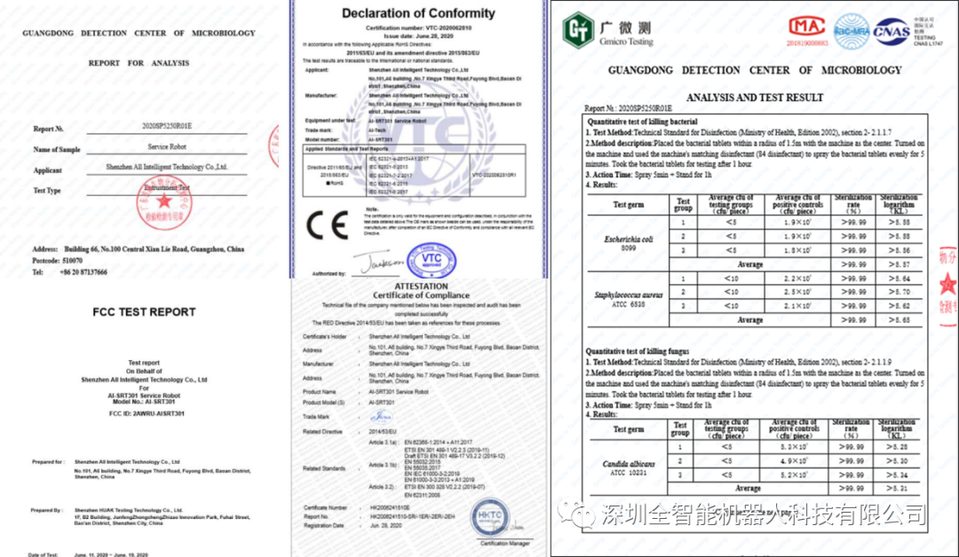 圖2:智能消毒機器人相關(guān)認證及檢測報告