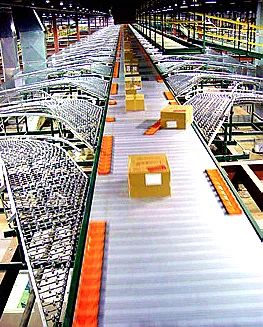 貨物從導(dǎo)入臺(tái)進(jìn)入滑靴式分揀系統(tǒng);
