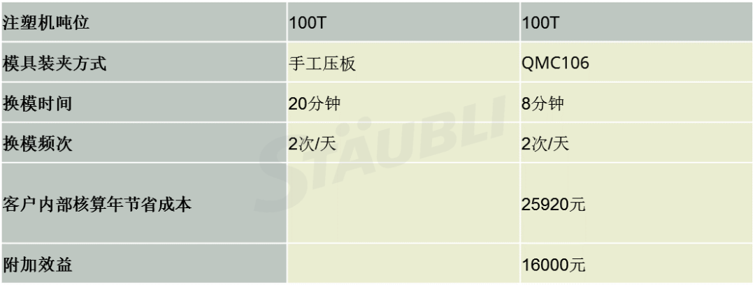 每臺100噸注塑機(jī)每年節(jié)省約41920元,意味著企業(yè)短期內(nèi)即可收回投資,這是當(dāng)之無愧的經(jīng)濟(jì)適用型快速換模解決方案!