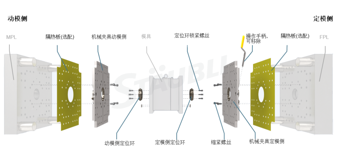 QMC106 能簡單方便地在現(xiàn)有設(shè)備上進(jìn)行安裝,采用螺釘就可將 QMC 106 的鎖緊基板固定到注塑機(jī)墻板上。同時,史陶比爾可提供專用安裝工具作為選配件,讓 QMC106 的安裝變得極為簡便。更值得一提的是,將模具上的中心定位環(huán)替換安裝為 QMC106 專用中心定位鎖緊環(huán)即可完成改造工作,省時省力。