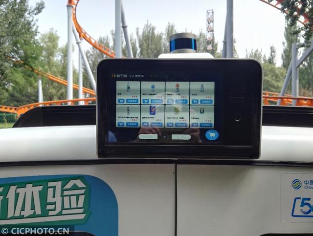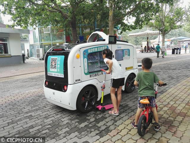 ↑2020年7月16日,北京朝陽公園內(nèi),無人駕駛移動(dòng)售貨車“朝售售”在運(yùn)營(yíng)中。CICPHOTO/杜建坡 攝