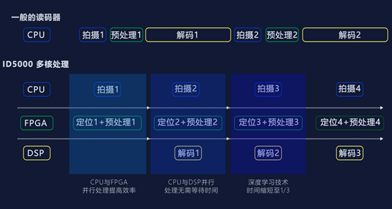 針對(duì)有自動(dòng)對(duì)焦、大視野大景深需求的行業(yè)應(yīng)用,我們發(fā)布了ID5000系列智能讀碼器。該系列智能讀碼器選用了高性能的多核深度學(xué)習(xí)核心處理器(多核深度學(xué)習(xí)如下圖示意),搭載機(jī)械調(diào)焦鏡頭,匹配多款不同分辨率的高性能Sensor,可輕松應(yīng)對(duì)各類復(fù)雜的工業(yè)讀碼場(chǎng)景。