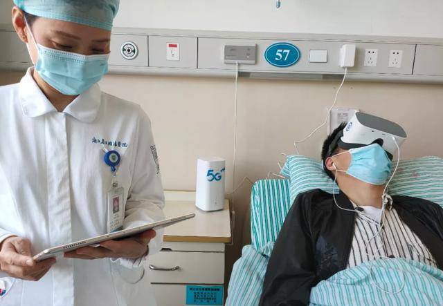 醫(yī)護人員正在用移動5G VR設備為他進行治療